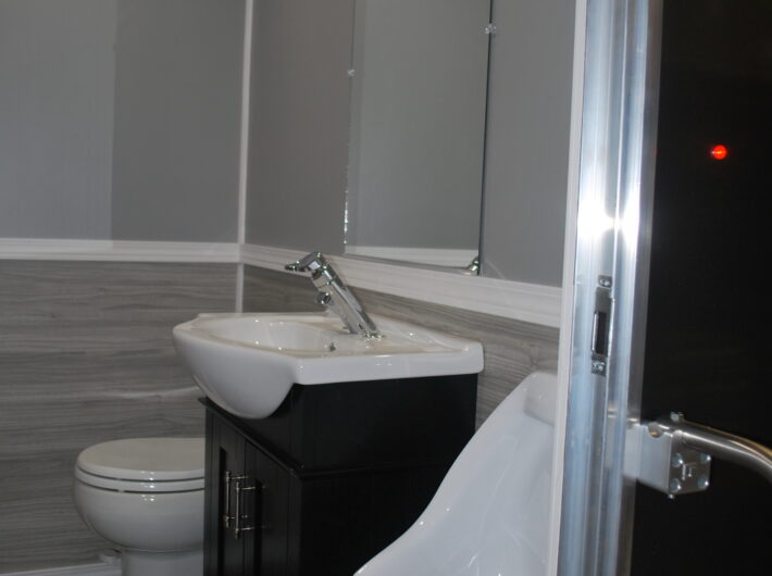 - Porcelain RV style water-saving toilets, one pint per standard flush